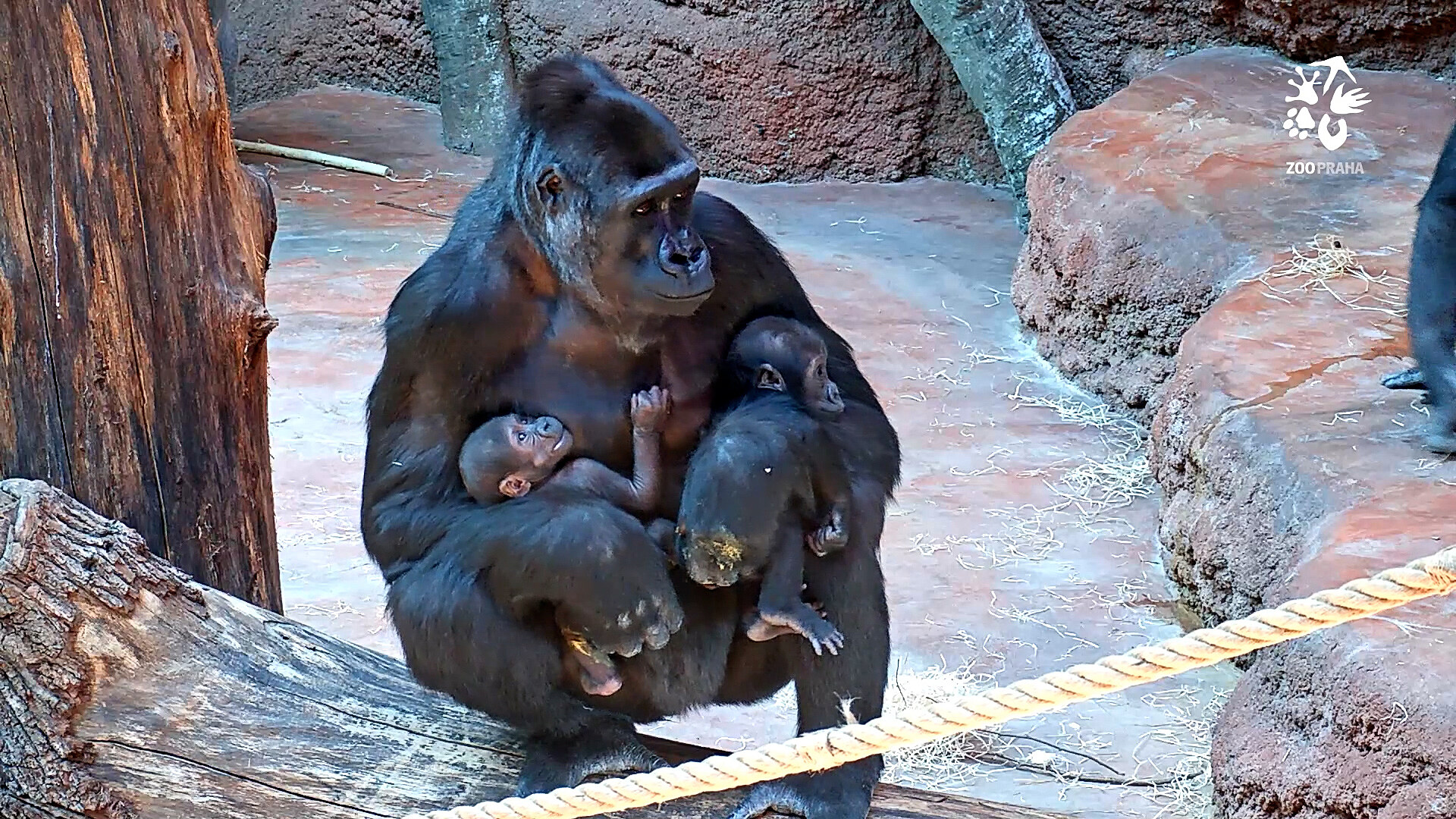 V pondělí ráno se tato pozoruhodná situace opakovala, byť po kratší dobu. Lze tak předpokládat, že se na podobnou souhru péče o obě gorilí mláďata mohou návštěvníci těšit i v příštích dnech. Chovatelé goril hlásí, že nejaktivnější bývají jejich svěřenci při krmení, které se v pavilonu odehrává vždy v 10 a v 15 hodin.
