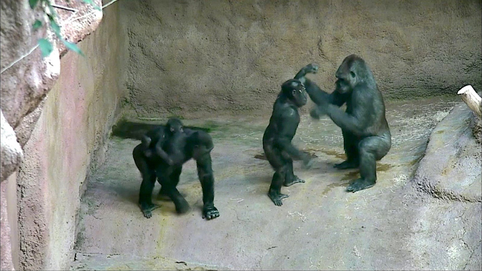 S dalšími dvěma gorilími samečky už si podle kurátora goril Víta Lukáše hraje víceméně bez zábran: „Jen v případě, že se něco šustne, je hned u mámy.“ I na videu je vidět, že si čas strávený se staršími nevlastními brášky (otcem všech tří je samec Richard) opravdu užívá.