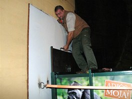 Místní chovatelé nijak neotáleli, přepravní bedna hned zamířila přímo k přepouštěcímu pavilonu. Upevnit box pásy, odjistit mříž. Pavel Brandl nemohl vydržet na místě, aby se alespoň špehýrkou krátce nepodíval do boxu. "Je to dobré, hýbe se, kroutí hlavou," pochvaloval si.
