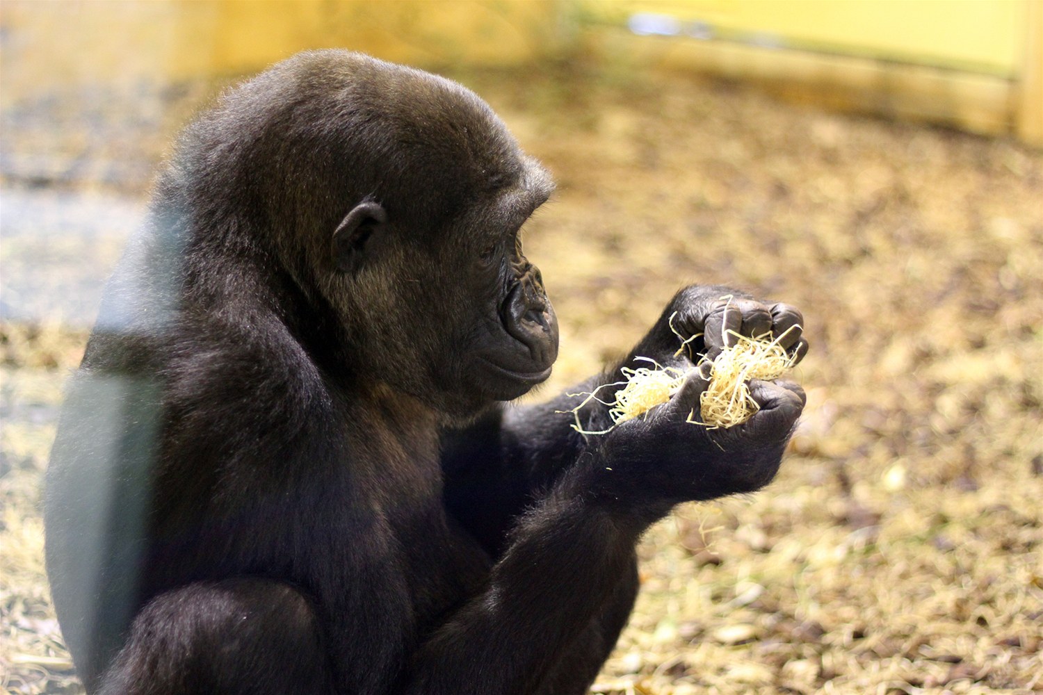Ošetřovatelé do pavilonu každý den chystají bohatou nabídku hraček, skrýší s dobrotami a hlavolamů. Zarolované a zavázané pytle, míče s oříšky uvnitř a po stěnách navěšené kelímky se semínky, pet lahve a různé trubky a krabice skrývající potravu nabízejí gorilám zábavu náhradou za to, že zatím nemají přístup do venkovního výběhu.