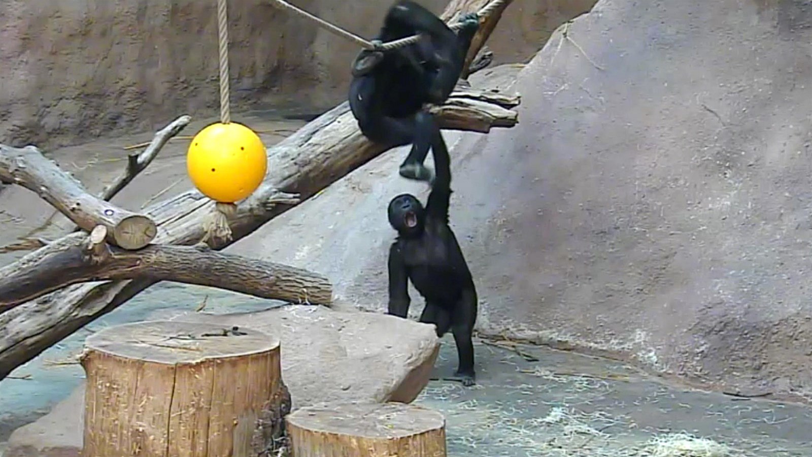 Bikira je sice stále na posledním místě v hierarchii skupiny (více o ní zde), ale hraje si s mláďaty - zatím kromě nejmladšího Ajabua - což chovatelé považují za úžasný pokrok. A hlavně ji skupina bere jako svého člena. Což je podstatné.