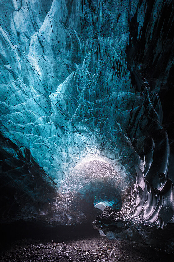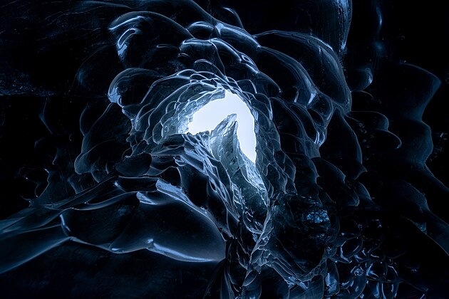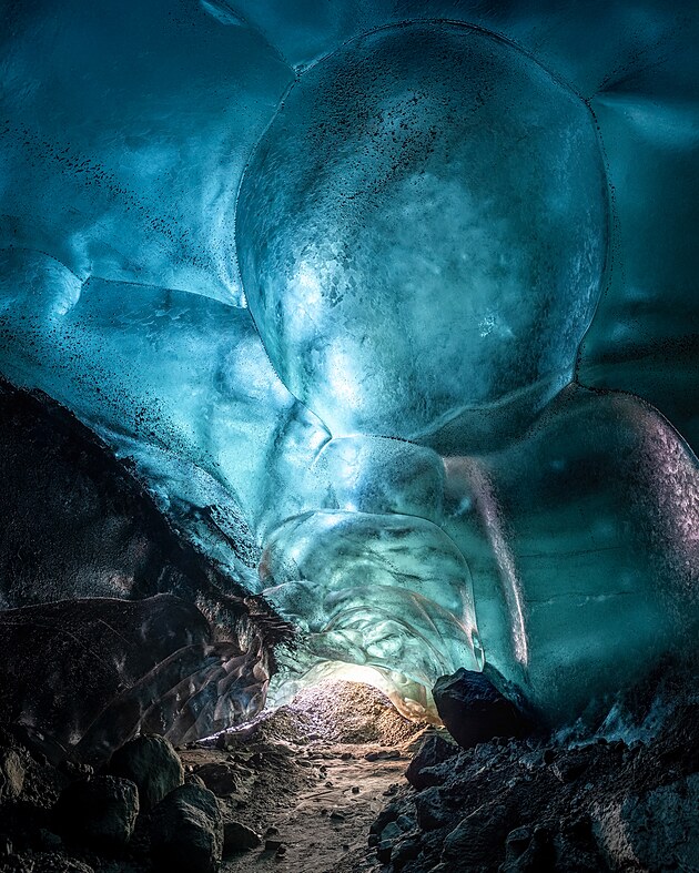 Ledová jeskyně získala téměř černý odstín díky vulkanickému popelu.