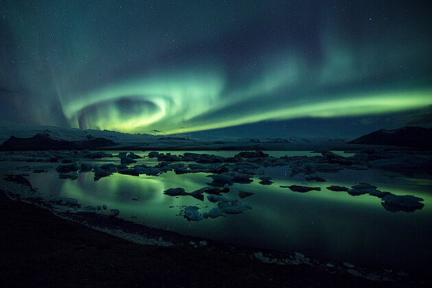 Jedna z Eričiných prvních fotografií polární záře u laguny Jökulsárlón na Islandu z roku 2016.
