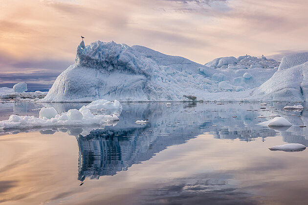 A fascinující Grónsko ještě jednou. Tentokrát racek sedící na vrcholu plovoucího ledovce ve fjordu Ilulissat.