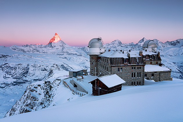 Úchvatný výhled na Matterhorn při východu slunce ve výšce 3100 m nad mořem z vyhlídkové plošiny za nejvýše položeným hotelem ve Švýcarských Alpách. (duben 2017)