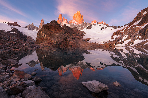 Východ slunce a dokonalý zrcadlový odraz hor v Laguna de los Tres v národním parku Los Glaciares, který je zapsán na seznamu světového dědictví UNESCO v Patagonii v Argentině. Foceno o Vánocích 2018 při vzácném bezvětří.
