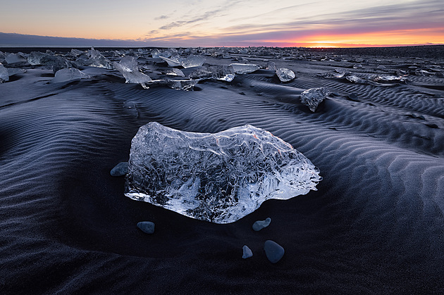 Diamanty, které netrvají věčně. Slavná islandská pláž s černým pískem, nazývaná také Diamantová pláž. Pro obrovské úlomky ledu z ledovce, unášené na břeh. (prosinec 2020 při odlivu)