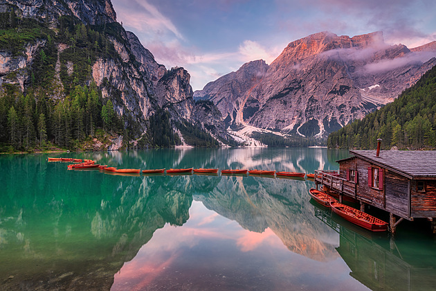 Horské jezero Lago di Braies v údolí Valle di Braies v italských Dolomitech v nadmořské výšce 1496 metrů (2020)