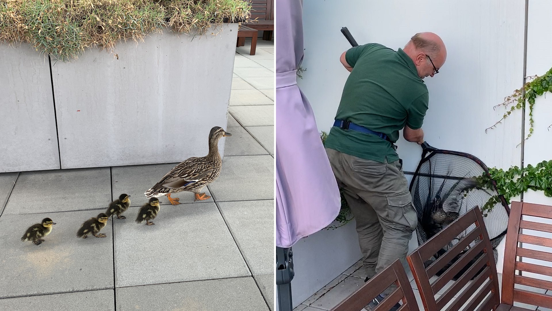 Predátorům takto bohužel podlehla tři kachňátka, zbyla čtyři. Poté jsme na terase začali na střídačku hlídkovat, abychom straky odradili. Podařilo se. Odpoledne dorazil pan Jaroslav ze záchranné stanice. Nastal čas chytit matku a čtyři mladé.