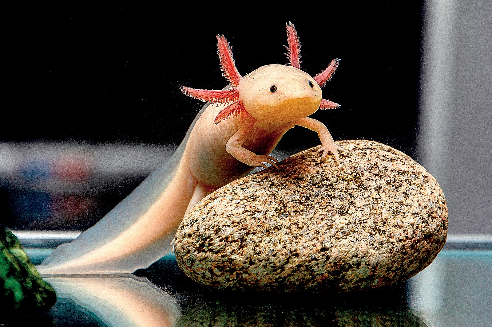 Axolotl sice nevydává zvuky, ale pozorně sleduje pohyb majitele za sklem a reaguje „tancem“ u hladiny, když čeká na krmení.