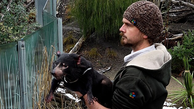 Chovatel David Vala při manipulaci s tasmánským čertem v Zoo Praha