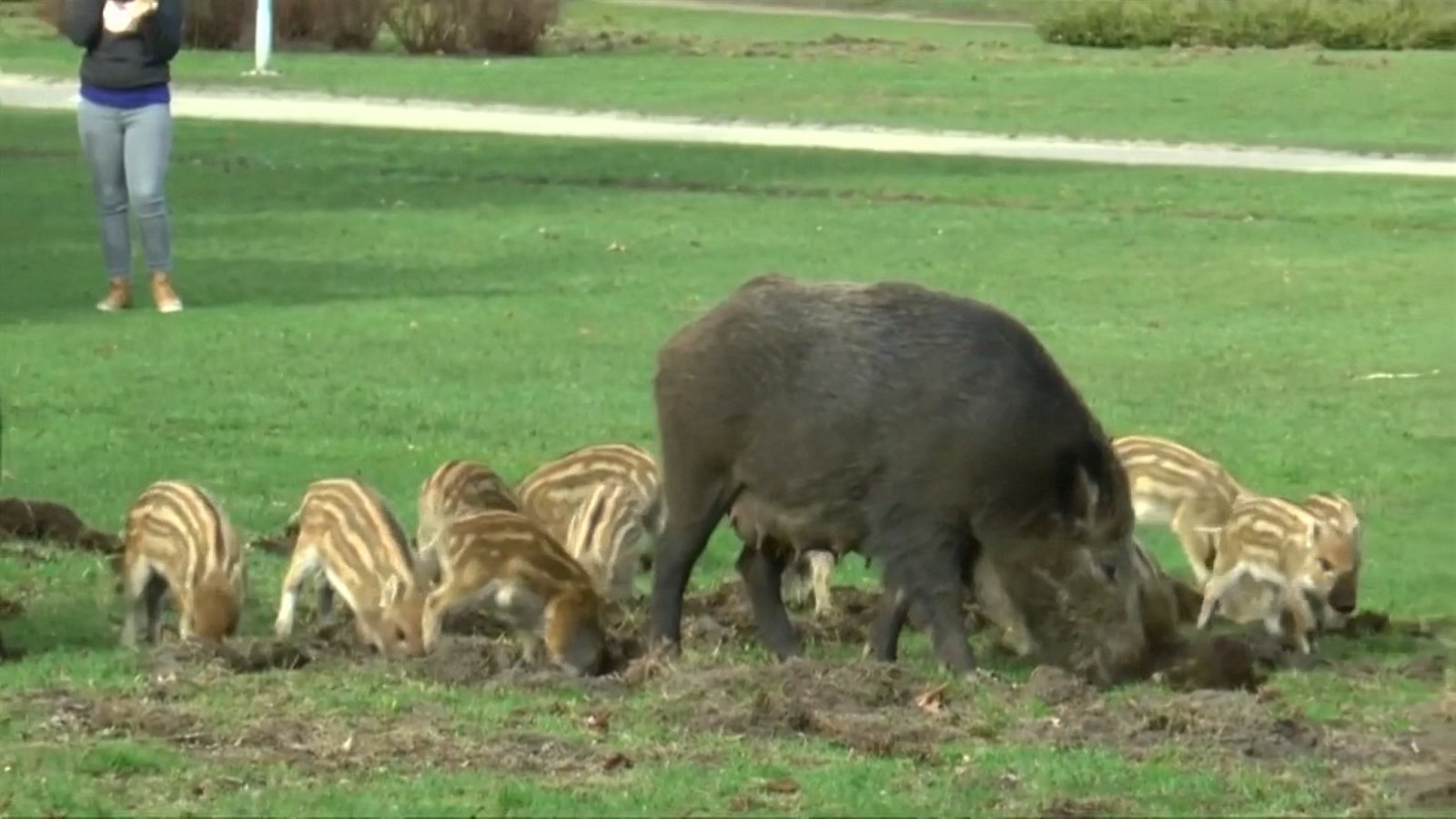 Naprosto nerušeně obě bachyně rozrývaly trávník a selata se nerozpakovala si to po matkách také vyzkoušet. Rozverně přitom poskakovala po trávníku, jen pár metrů od zvědavců: přihlížejících, fotících a natáčejících.