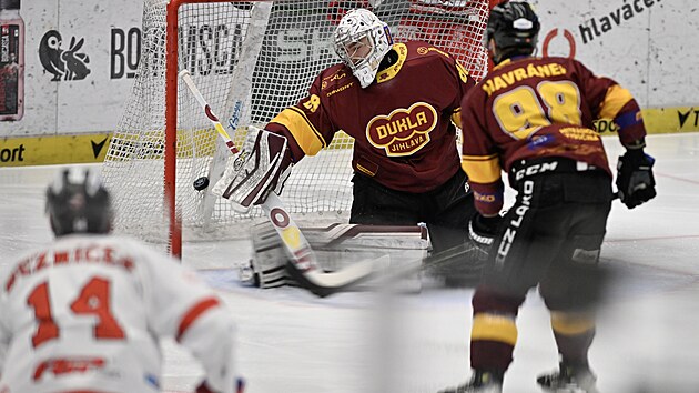 - Vedení Dukly. Spokojenější po první třetině odcházeli do šaten jihlavští, kteří potrestali faul Jakuba Orsavy na brankáře Adama Berana. Jan Strejček potřeboval jen sedm sekund přesilovky, aby prostřelil Matěje Machovského a zařídil Dukle vedení.
