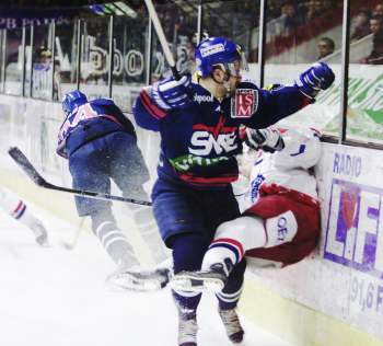 Reprezentační obránce Aleš Píša (v bílém dresu) z Pardubic padá po zákroku vítkovického beka Galvase. |