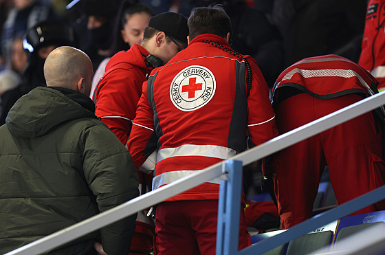 „Záchranáři nyní muže převážejí do nemocnice,“ uklidňoval fanoušky v hale hlasatel.