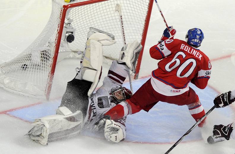 SPECIALISTA NA OSLABENÍ. Český kapitán Tomáš Rolinek překonává Egdarse Masalskise v oslabení. Dal první gól týmu proti Lotyšsku a pak se zranil.