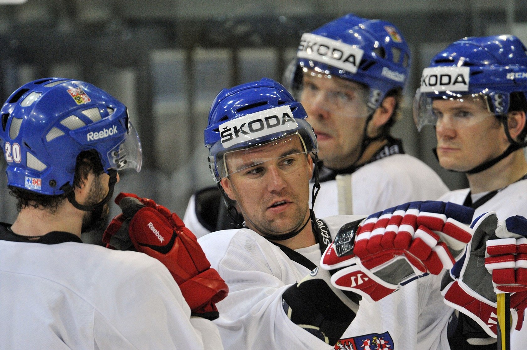 TRÉNINK. Čeští hokejisté se radí na tréninku před zápasem s Kanadou.