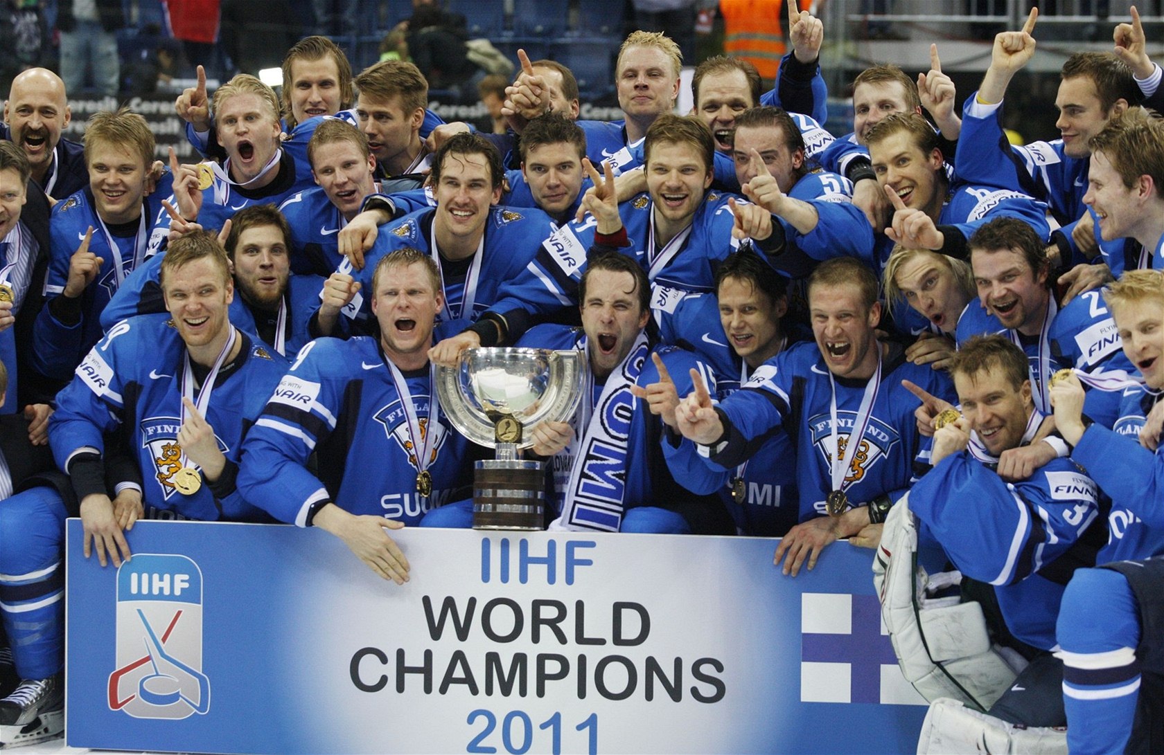 MISTŘI. Finové slaví titul hokejových šampionů pro rok 2011.