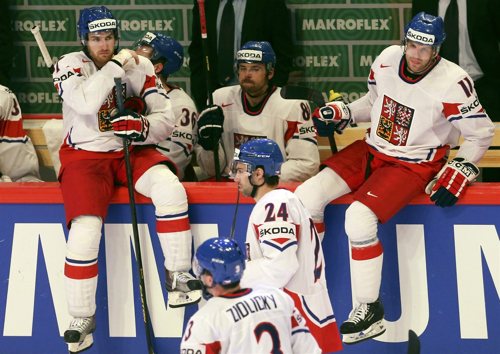 SMUTEK. Čeští hokejisté jsou zklamaní po čtvrtfinálové porážce se Švýcarskem.