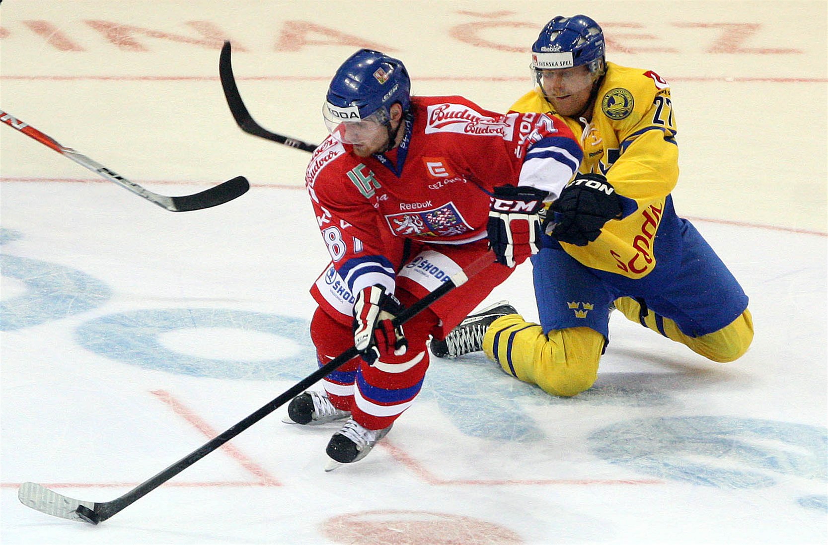 Český obránce Jakub Nakládal (vlevo) ujíždí s pukem Patriku Hörnqvistovi ze Švédska.