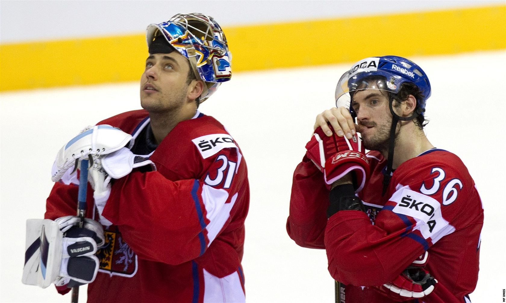 KDYŽ ZNÍ ŠVÉDSKÁ HYMNA... Čeští hokejisté Ondřej Pavelec (31) a Petr Čáslava sledují, jak halou stoupá švédská vlajka.