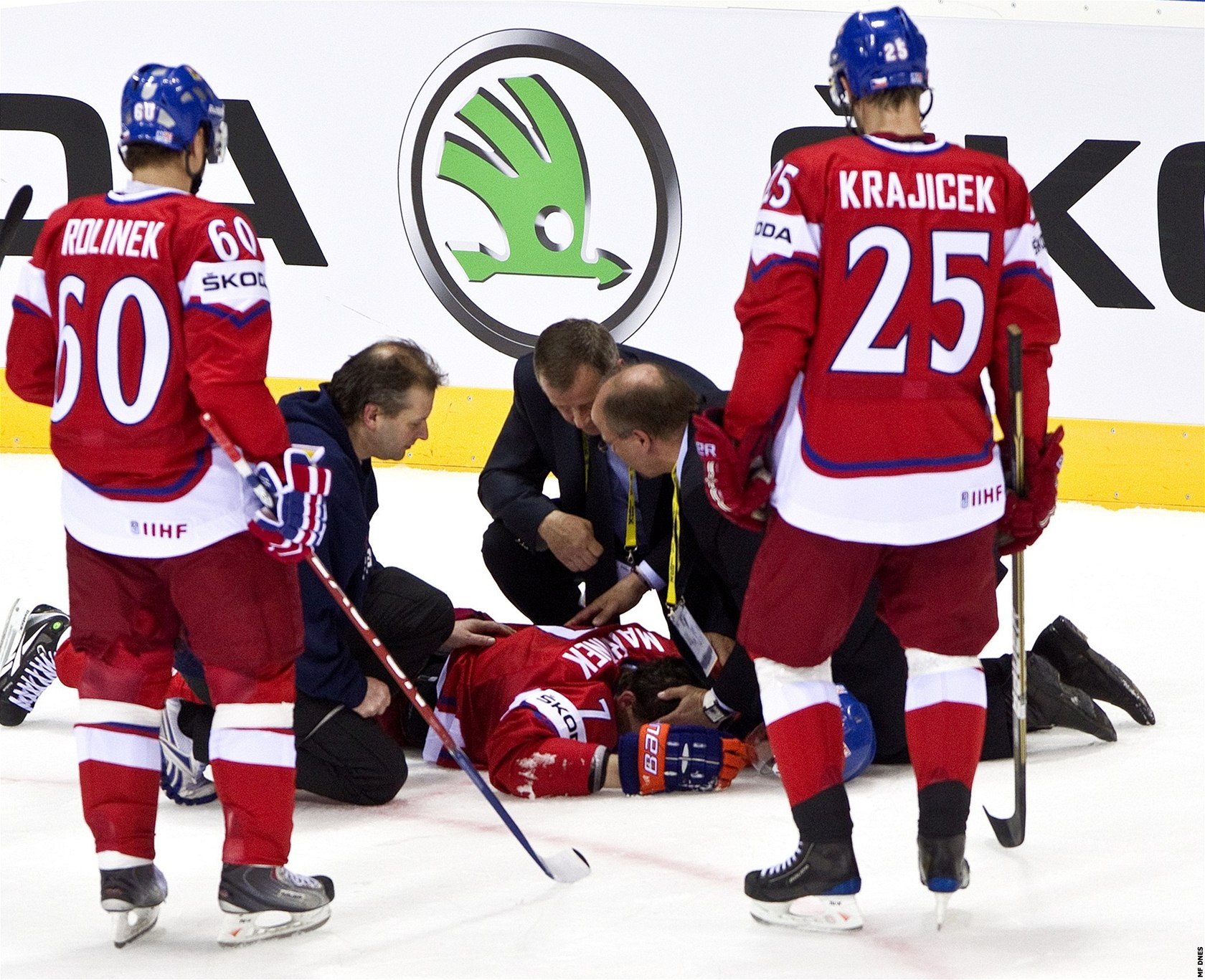 JE ZLE. Nad zraněným Radkem Martínkem se sklánějí členové českého realizačního týmu, přihlížejí Rolinek a Krajíček.