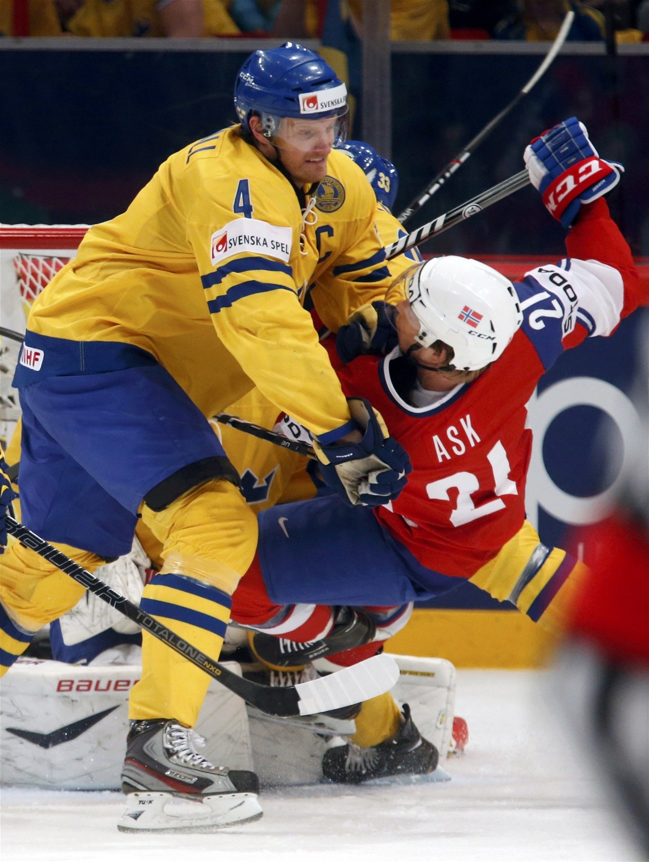 Švéd Staffan Kronwall (vlevo) posílá k ledu Nora Mortena Aska.