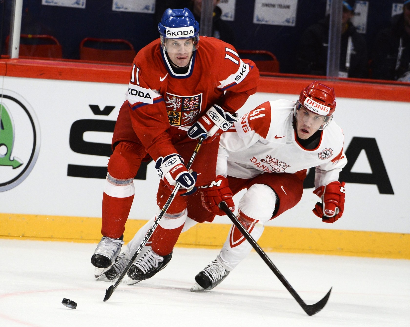 Český útočník Petr Hubáček (vlevo) a Dán Jesper Jensen se ženou za pukem.