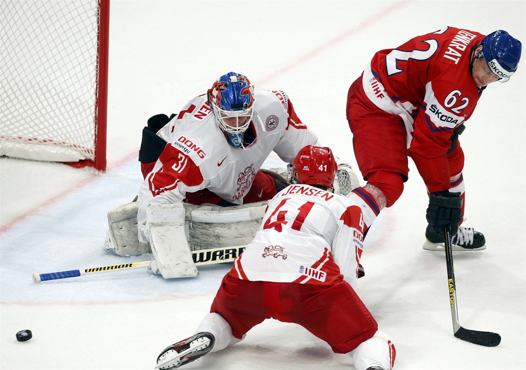Český útočník Petr Tenkrát v šanci před dánským gólmanem Simonem Nielsenem.