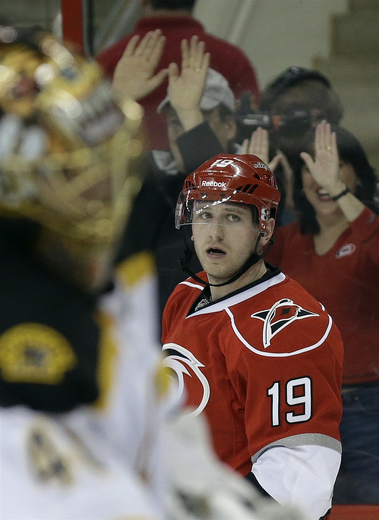 Jiří Tlustý z Caroliny po jednom ze svých dvou gólů proti Bostonu.