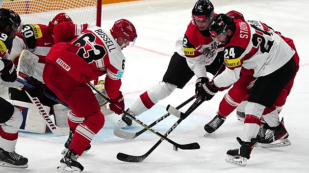 Oba týmy v úvodu zápasu nevyužily přesilovou hru. Dánové otevřeli skóre v 10. minutě, když se k Nikolaji Ehlersovi mezi kruhy odrazil puk a útočník Winnipegu prostřelil Kickerta. Na světovém šampionátu dal už čtvrtou branku. V závěru první části rakouský obránce Heinrich nastřelil tyčku.