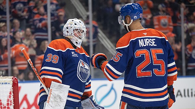 Connor Ingram (39) a Darnell Nurse (25) slaví výhru Edmonton Oilers.