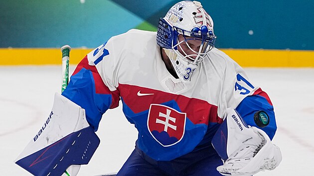 Slovenský brankář Samuel Hlavaj při zákroku proti finské střele. (11. února...