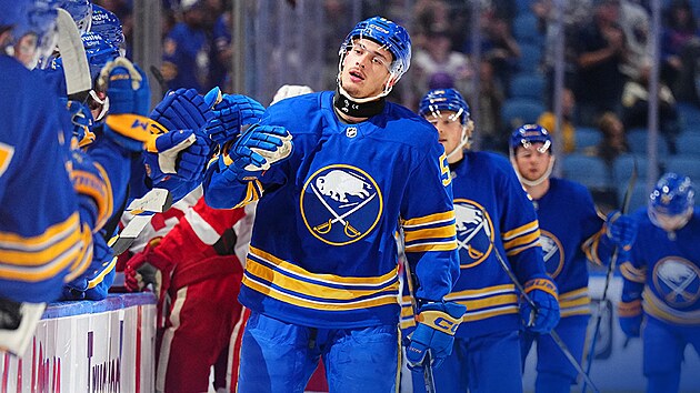 Radim Mrtka se raduje ze svého premiérového gólu v přípravě v dresu Buffala.