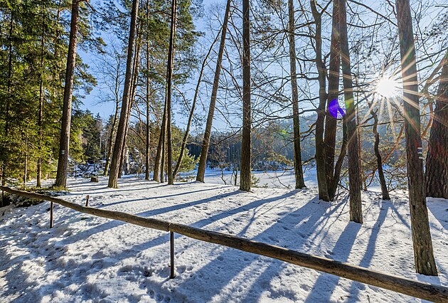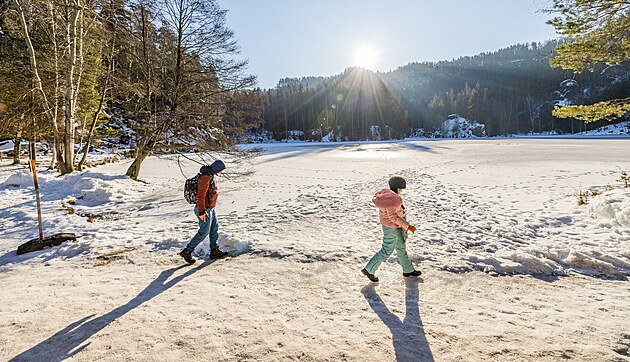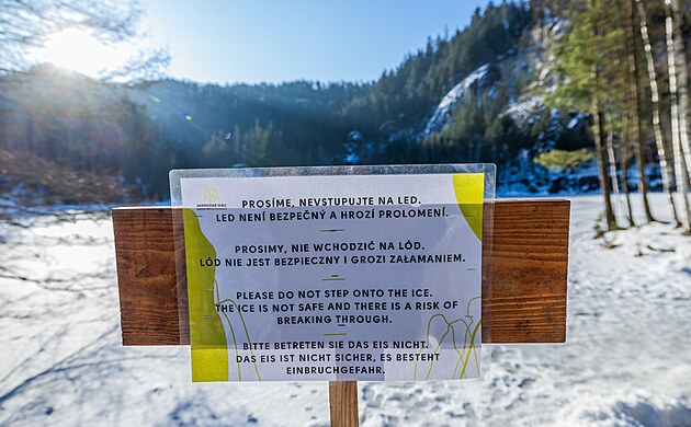 Jezírko sice kryje led, avšak po oblevách je riskantní na něj vstupovat.