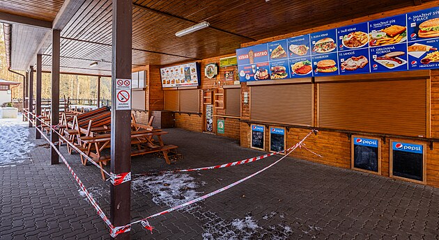 Turisté by si neměli zapomenout svačinu. Pouze jedna restaurace v dosahu skalního města má otevřeno od pátku do neděle. Další možností je kavárna na zámku, otevřená je denně mimo pondělí od 10 do 16 hodin. K vidění na zámku jsou expozice a úniková hra Třetí princ. Na snímku jsou stánky s občerstvením, které mimo sezonu prodejci zavřeli.