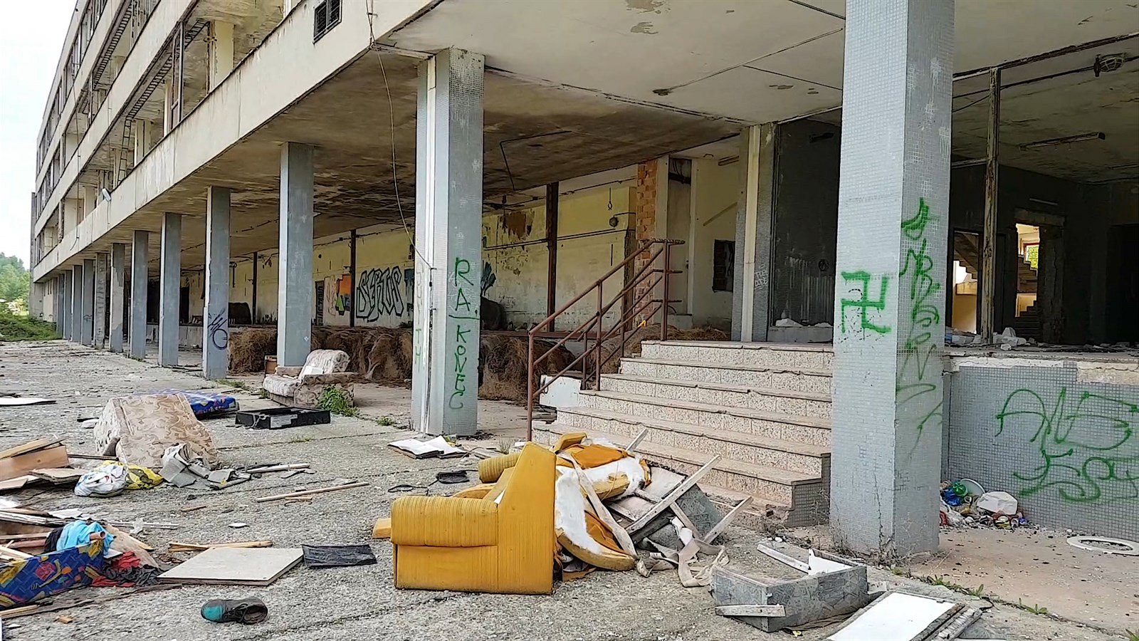 Drobné plastové kuličky roztroušené na zemi zase poukazují na přítomnost vyznavačů airsoftových zbraní. Po bývalém nájemci, který objekt využíval jako sklad, tu ještě zbyly igelitové obaly. Na obou stranách podlouhlé budovy se hromadí staré matrace, pohovky a pneumatiky.