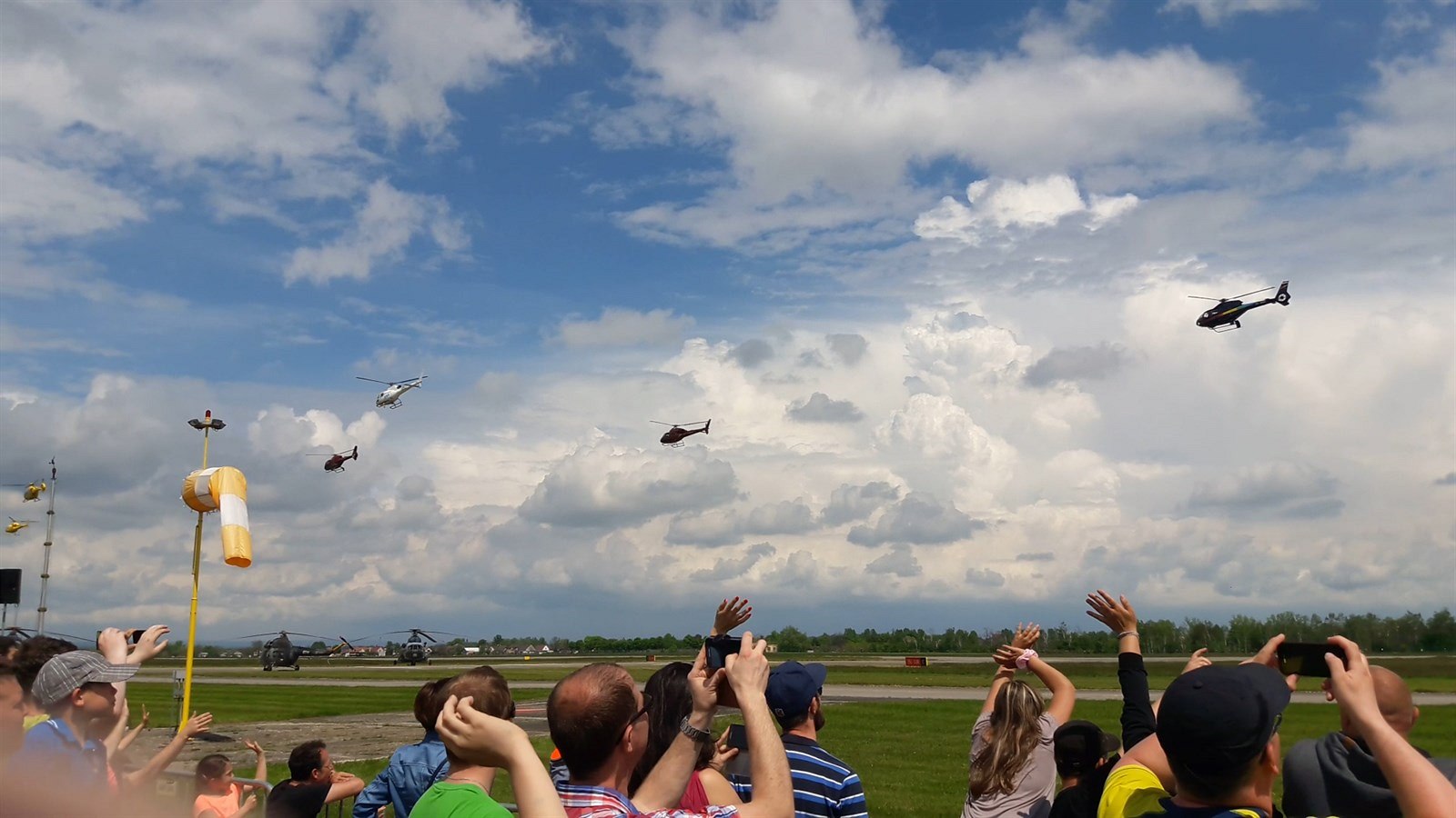Následoval hromadný průlet hned devíti vrtulníků a dále ukázka lehkého vrtulníku Robinson R44. Dech se divákům tajil zejména u akrobatického představení legendy akrobatického létání rakouského šéfpilota Siegfrieda „Blacky“ Schwarze z týmu The Flying Bulls, který usedl do vrtulníku BÖ105.