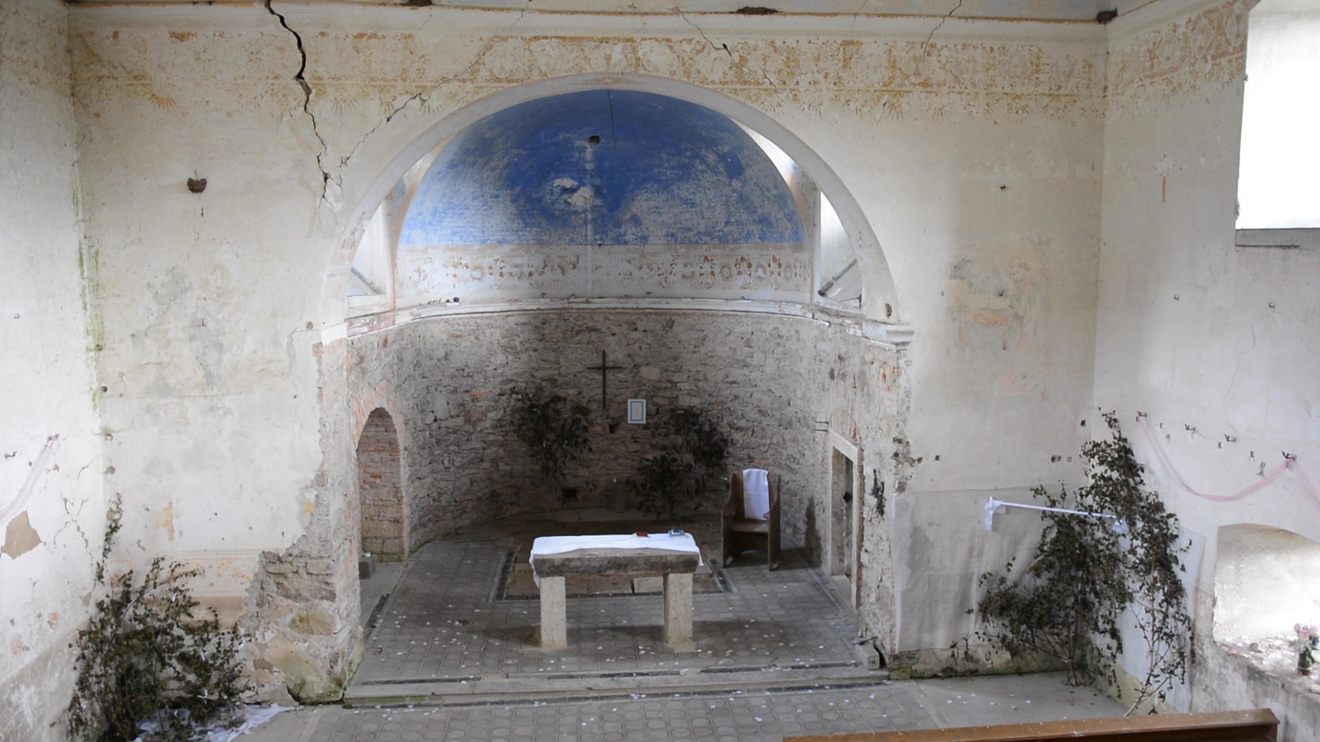 Uvnitř kostela již stojí lešení, na strohém oltáři je otevřené Písmo svaté v obrazech. V jednom rohu se šklebí dlouhá prasklina a létají tu jiřičky, které si na několika místech postavily hnízda. Okolo stavby už jsou upravené výkopy odvodnění a malebný hřbitov už díky práci dobrovolníků nepřipomíná džungli.