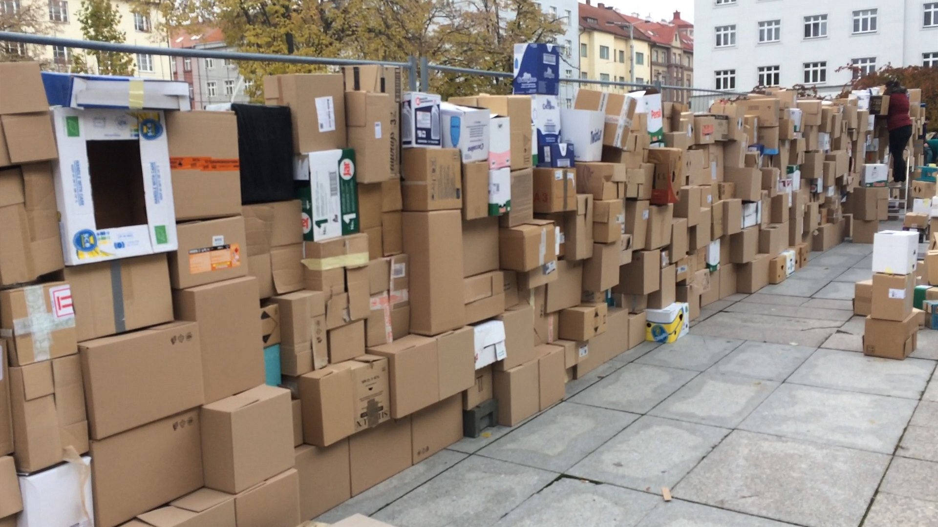 „Nerovnej to, dej krabice na přeskáčku, ať to nevypadá jako v regálu,“ ozývají se z druhé strany zdi pokyny. Kartonová stěna se rychle rozrůstá. I když sem budou moci lidé nosit krabice až do 19. listopadu, není jisté, že se podaří zeď zrekonstruovat v celém rozsahu.
