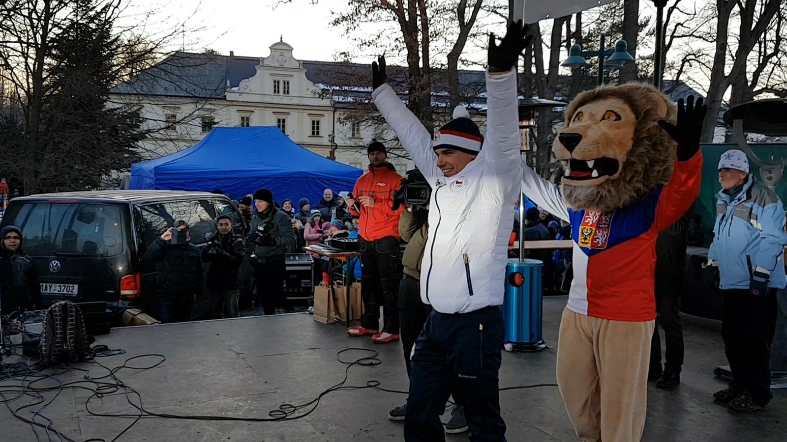 Stovky návštěvníků se na náměstí T. G. Masaryka sešikovaly už dvě hodiny po poledni. Zatímco Eva Samková teprve byla na cestě, Michal Krčmář už chodil mezi diváky, přijímal gratulace a rozdával rozhovory. Na velkém plátně mezitím běžely záznamy medailových závodů vrchlabských olympioniků.