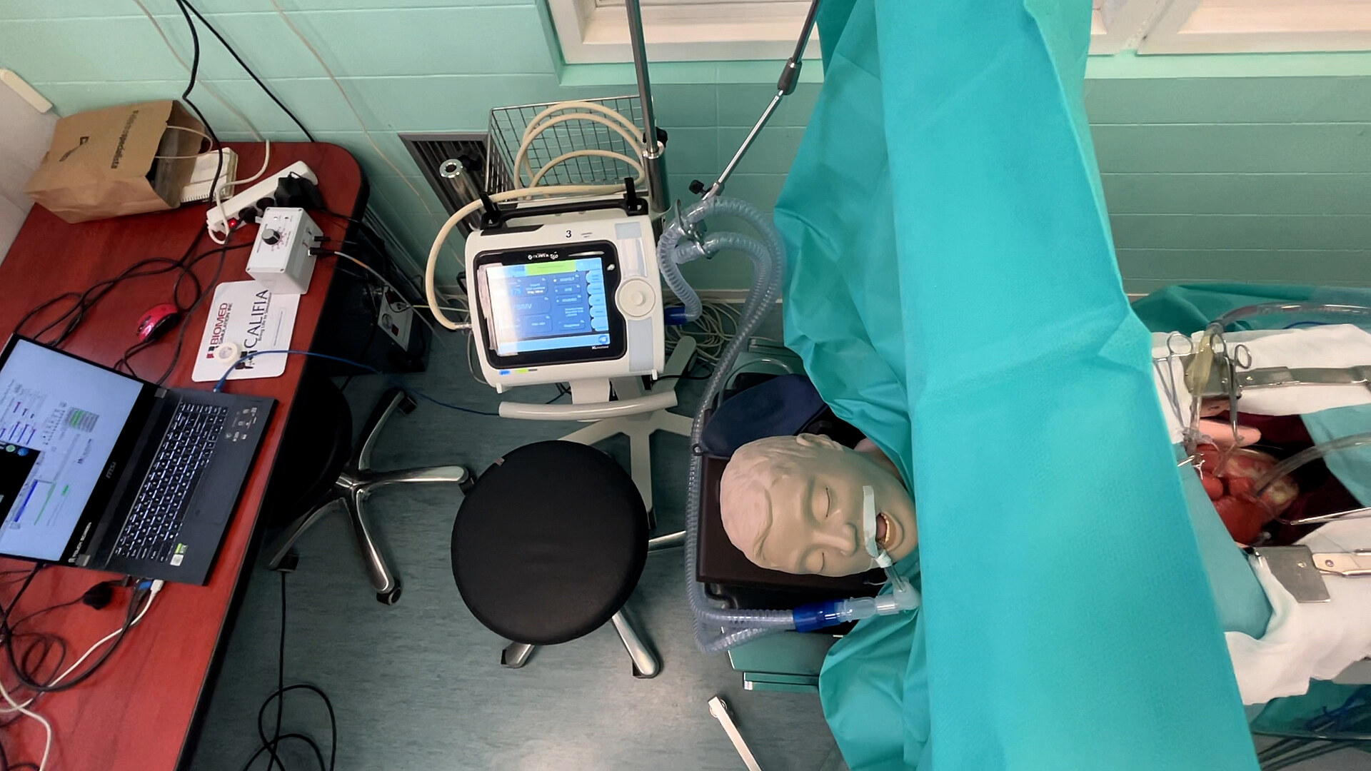 Vybavení místnosti se přitom neliší od běžného operačního sálu, jen na stole leží místo skutečného pacienta figurína vybavená simulační technologií, která dokáže lékařským přístrojům modelovat různé kritické stavy, které mohou při operaci srdce nastat.