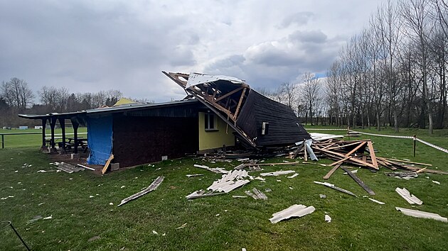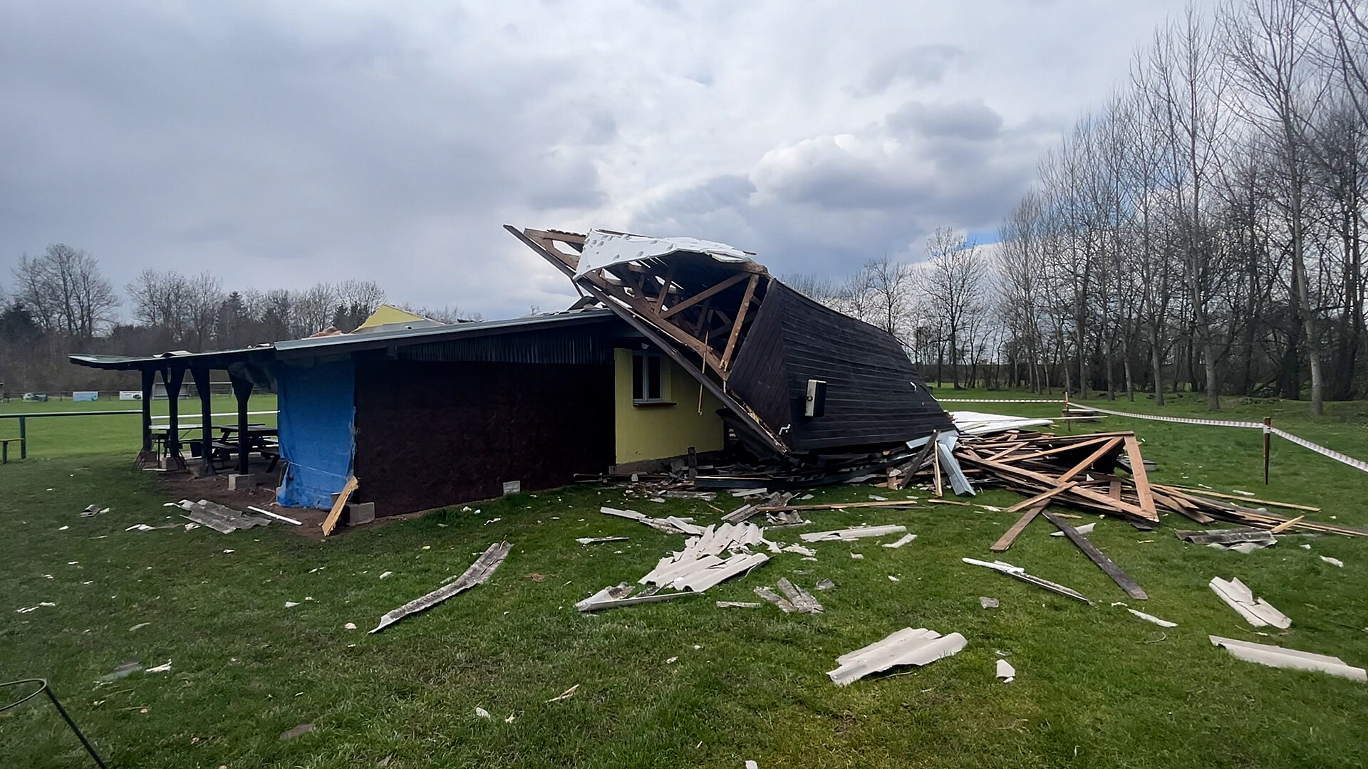 Prudký vítr se jako by z ničeho nic snesl na hřiště, utrhl z budovy střechu i s kusy zdiva a pak zmizel neznámo kam. V obci o kus dál škody nenapáchal.