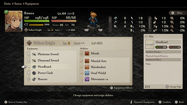 Připomínám, že ve FFT funguje zajímavý systém jobů čili povolání. Existují tu dva vývojové stromy se vzájemnými průniky. Na jedné straně je akcent na fyzický boj, jako tomu je v případě Knighta, Monka a později kupříkladu Ninji. Na druhé převládá magie v podání povolání jako Black Mage, Time Mage a později třeba Summoner. Povolání a s nimi spojené unikátní dovednosti se zpřístupňují postupem času, obě položky můžete nesmírně interesantním způsobem mixovat a vytvářet hrdiny eventuálně ušité na míru nepříjemnostem, jež na vás za nejbližším rohem čekají.