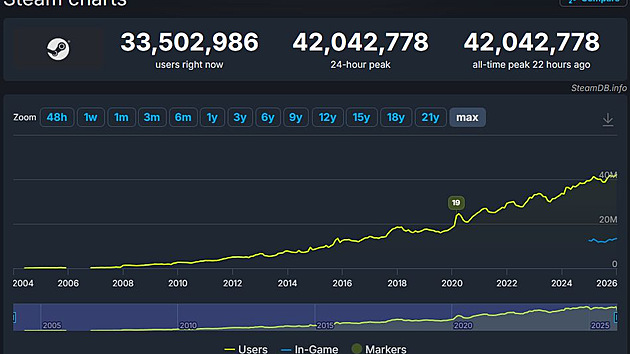 Steam mělo v jeden moment spuštěný 42 042 778 hráčů souběžně, z toho jich nějakou hru právě hrálo 13 399 958, uvádí SteamDB. Pohled na graf pak ukazuje, že od svého oficiální spuštění v roce 2005 neustále roste.