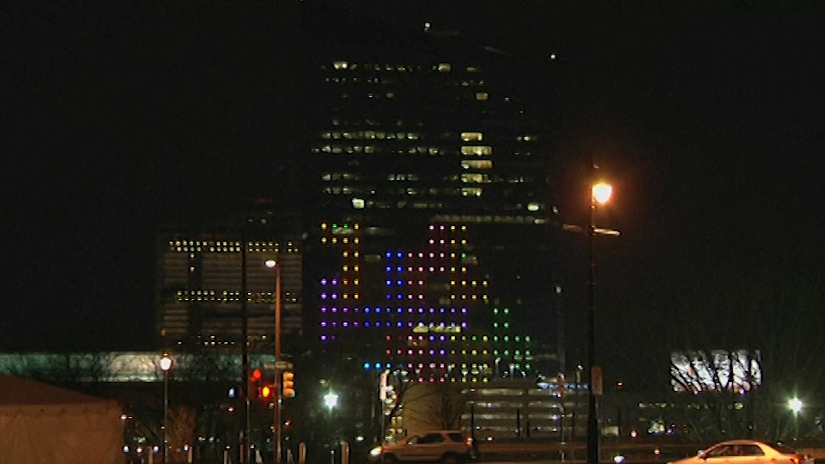 Na skleněné fasádě tohoto mrakodrapu se obvykle pomocí stovek LED světel promítají po setmění náhodné geometrické tvary, v sobotu 5. dubna však na dvou stranách budovy ovládali hráči počítačem generované obrazce složené ze čtverců o velikosti oken.