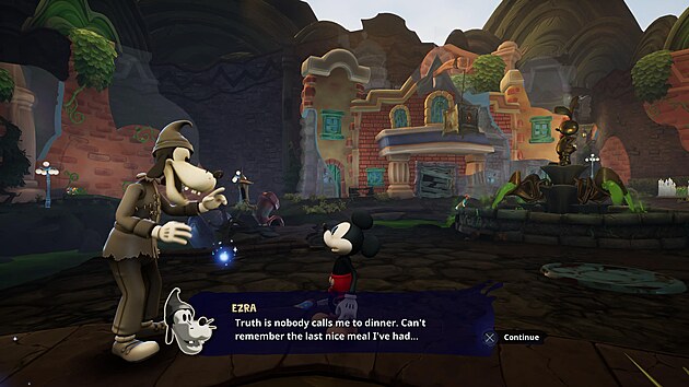 Ne tedy, že by na něm nějak obzvlášť záleželo, více než o ucelené vyprávění jde spíše o poctu starým filmům od Disneyho. Myšák totiž zachraňuje kouzelnou říši Wasteland, kterou obývají pozapomenuté postavičky z historie značky. Potkáte tak například králíka Oswalda, koně Horáce nebo krávu Clarabelle, povědomé bude i zasazení některých úrovní inspirovaných staršími díly seriálů nebo atrakcí z Disneyworldů.