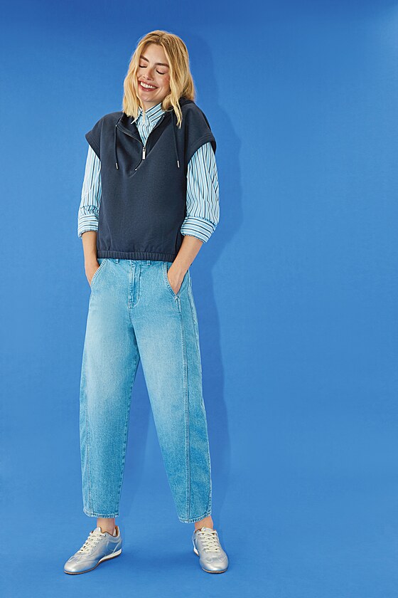 Stále oblíbenější jsou i džíny s puky, které působí formálněji a opticky prodlužují postavu. Ačkoli jsou ve světlém odstínu a volném střihu, nevypadají až tak volnočasově. Pro ležérnější styl k nim oblékněte mikinu, ale pokud se chystáte na oběd do restaurace, doporučujeme sako. Cena 2199 Kč