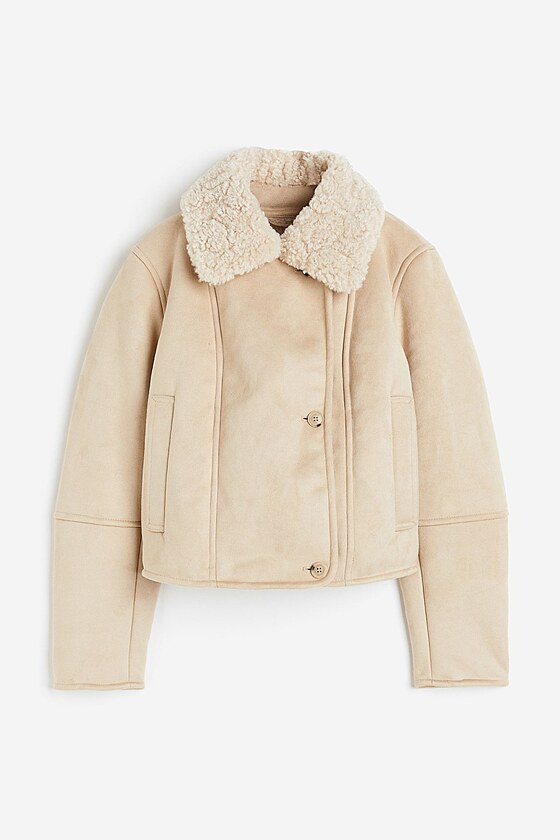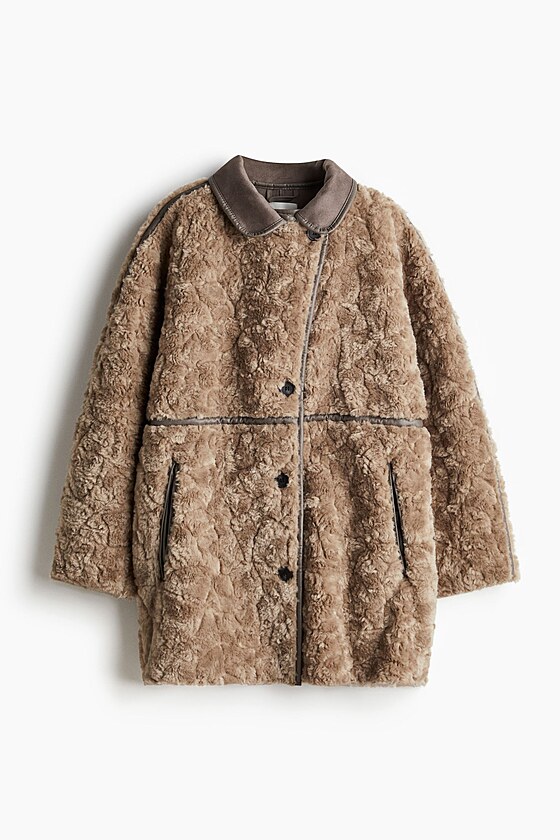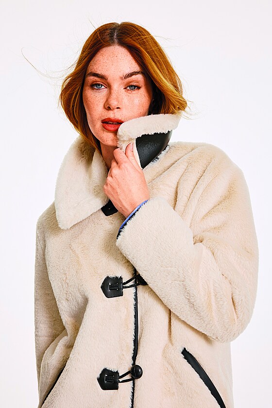 Krátký kabát volného střihu s raglánovými rukávy je ušitý z imitace ovčí kožešiny. Cena 1459 Kč