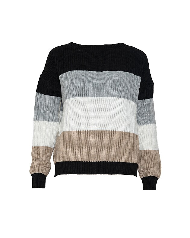 Svetr perfektně sladíte s kabátem, pokud se bude i na něm opakovat základní, béžová barva. Cena 909 Kč